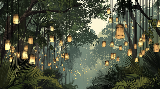 Προβολή πλήρων λεπτομερειώνPapel pintado bosque encantado | Linternas colgantes iluminando un paisaje verde