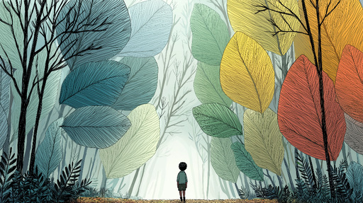 WonderMuralΑυτό το μαγευτικό σχέδιο δείχνει ένα παιδί που στέκεται στην καρδιά ενός μαγικού δάσους, περιτριγυρισμένο από πολύχρωμα φύλλα σε αποχρώσεις του μπλ...