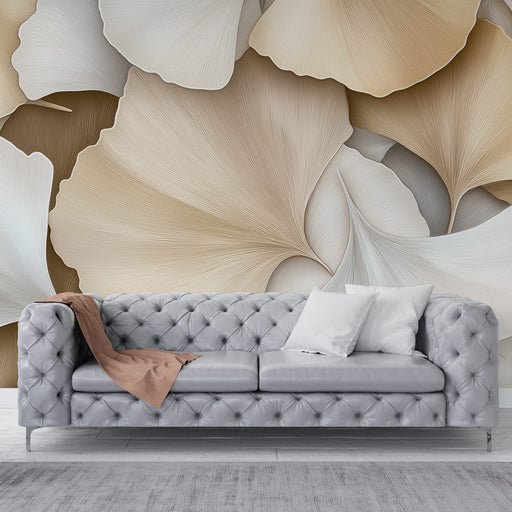 WonderMuralΑυτό το ταπετσαρία υπογραμμίζει ένα μοτίβο μεγάλων υφασμάτινων φύλλων σε χρυσές αποχρώσεις, φέρνοντας μια νότα κομψότητας και ζεστασιάς στο εσωτερι...