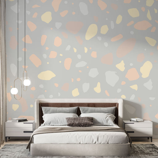 Studio Sama```html Ανακαλύψτε την ταπετσαρία τοίχου terrazzo σε παστέλ τόνους σε γκρι φόντο, ιδανική για να προσθέσετε μια μοντέρνα και κομψή πινελιά στο εσωτ...