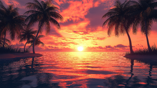 Προβολή πλήρων λεπτομερειώνΤαπετσαρία τροπικό ηλιοβασίλεμα | Γαλήνιο υδάτινο τοπίο με φοίνικες