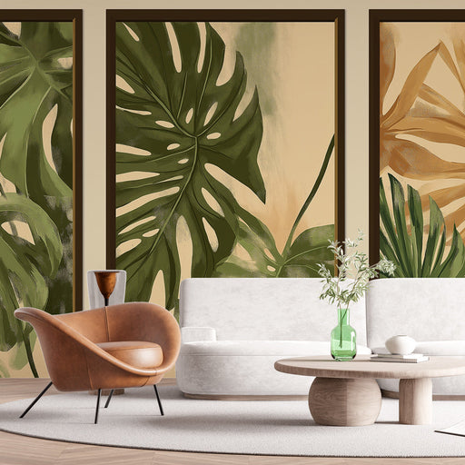 WonderMuralΘαυμάστε το εξαιρετικό μας ταπετσαρία τοίχου με ένα τρίο από τροπικά φύλλα, όπου οι αποχρώσεις του πράσινου αναμειγνύονται με οχρέ αποχρώσεις για ν...