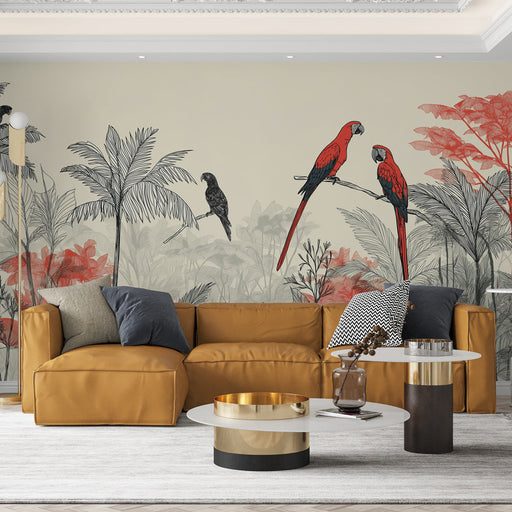 WonderMuralΤο αποκλειστικό μας ταπετσαρία τοίχου διαθέτει κόκκινους παπαγάλους που κάθονται σε κλαδιά, περιτριγυρισμένοι από μια πλούσια ποικιλία τροπικής φυτ...