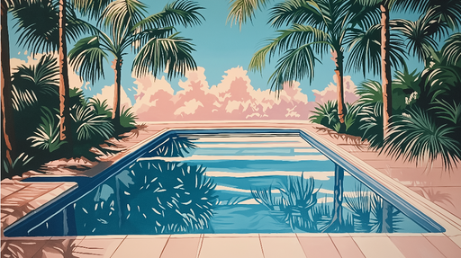 Προβολή πλήρων λεπτομερειώνTapete τροπικής πισίνας | Καταπραϋντική θέα μιας πισίνας που περιβάλλεται από φοίνικες και παστέλ ουρανό