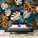 Ταπετσαρία τοίχου monstera | Πορτοκαλί, μπλε και μπεζ φύλλα monstera