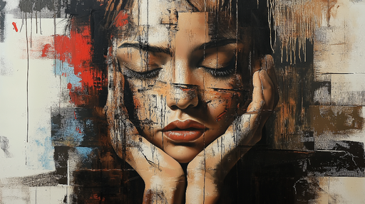 Προβολή πλήρων λεπτομερειώνΤαπετσαρία τοιχογραφίας αφηρημένο πορτρέτο | Γυναίκα με εκφραστικό πρόσωπο και πλούσιες υφές