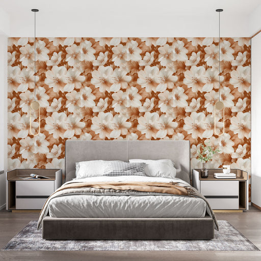 WonderMuralΑυτό το τοιχογραφία με λουλούδια διαθέτει μια συλλογή από εξαιρετικά μοτίβα λουλουδιών σε ζεστές αποχρώσεις πορτοκαλί και μπεζ, δημιουργώντας μια φ...