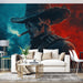 Αυτή η μοναδική ταπετσαρία τοίχου διαθέτει έναν σκελετό καουμπόι με έντονη ματιά, σε μια ατμόσφαιρα που είναι τόσο σκοτεινή όσο και μυστηριώδης. Οι αντιθετικές αποχρώσεις του μπλε και του κόκκινου δημιουργούν ένα δραματικό αποτέλεσμα, ενώ ο καπνός που διαφεύγει από το πούρο του προσθέτει μια ενδιαφέρουσα πινελιά στο σύνολο.