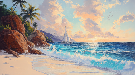 Tapete seascape | Ιστιοπλοϊκό σε μια παραδεισένια παραλία κατά το ηλιοβασίλεμα