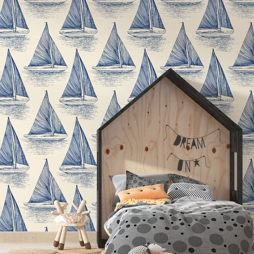 WonderMuralΤο ταπετσαρία μας διαθέτει ένα γοητευτικό σχέδιο ιστιοφόρου που έχει σχεδιαστεί με το χέρι, με απαλά σκιασμένα μπλε πανιά σε απαλό κρεμ υπόβαθρο. Α...