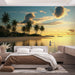 Αυτή η ταπετσαρία τοίχου απεικονίζει ένα εκπληκτικό τροπικό τοπίο, αναδεικνύοντας μια ειδυλλιακή παραλία κατά τη δύση του ηλίου. Οι σιλουέτες των φοινικόδεντρων στέκονται χαριτωμένα ενάντια σε έναν ουρανό με χρυσές και μπλε αποχρώσεις, δημιουργώντας μια χαλαρωτική και ήρεμη ατμόσφαιρα.