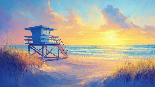 Προβολή πλήρων λεπτομερειώνTapete sunset beach | Μια γαλήνια σκηνή παραλίας με έναν πύργο του ναυαγοσώστη