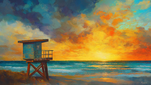 Προβολή πλήρων λεπτομερειώνTapete sunset over the sea | A vibrant scene of a lifeguard hut by the ocean