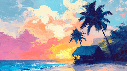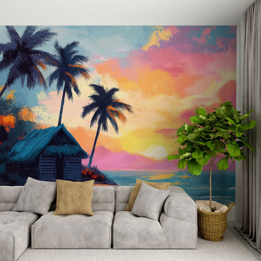 Προβολή πλήρων λεπτομερειώνTapete παραλίας στη δύση του ηλίου | Ένα ζωηρό τροπικό τοπίο με φοινικόδεντρα και ένα ξύλινο καλύβι