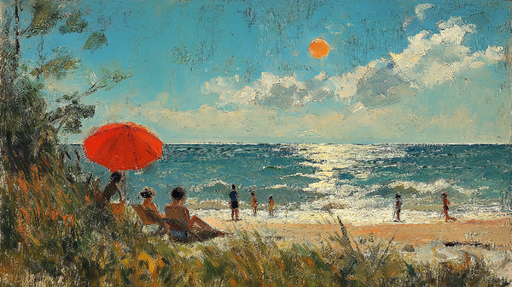 WonderMuralΤο ταπετσαρία μας θυμίζει μια καλοκαιρινή ατμόσφαιρα με ένα πορτοκαλί και λευκή ριγέ παρασολένα και άνετα ξαπλώστρες, φυτεμένα σε μια γαλήνια ακτή....