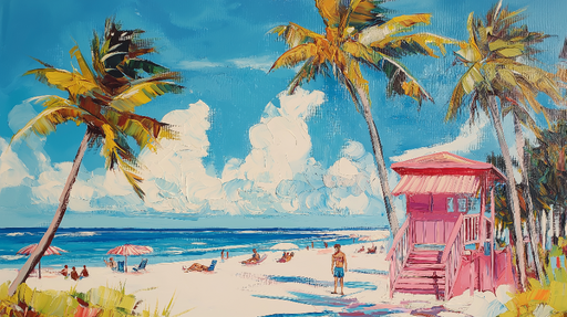 Προβολή πλήρων λεπτομερειώνTapete sunny beach | Ζωηρή παραλία με φοίνικες και καλύβα ναυαγοσώστη