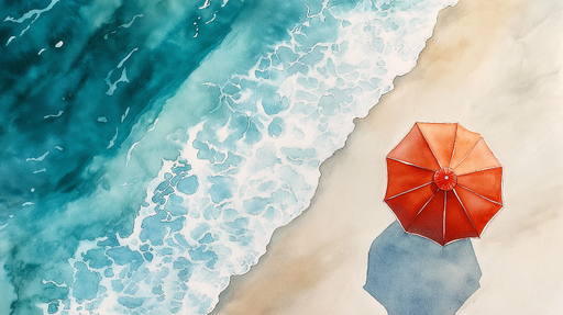Προβολή πλήρων λεπτομερειώνΤαπετσαρία Τοίχου ηλιόλουστη παραλία | Ζωηρή καλοκαιρινή σκηνή με κόκκινη ομπρέλα και διαφανές θάλασσα