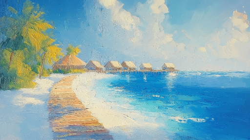 Προβολή πλήρων λεπτομερειώνTapete παραλίας παραδείσου | Σκηνή διακοπών με βίλες πάνω από το νερό και καταπράσινους φοίνικες