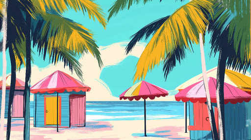 Προβολή πλήρων λεπτομερειώνTapete sunny beach | Ζωηρά φοίνικα και πολύχρωμες καλύβες σε αμμώδη παραλία