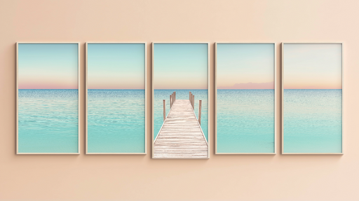Η κρεβατοκάμαρα γίνεται κουκούλι ηρεμίας με τις ωκεάνιες όψεις μας σε παστέλ τόνους. Για το σαλόνι, τολμήστε να χρησιμοποιήσετε μια μεγάλη πανοραμική που ανοίγει το χώρο στον απέραντο ορίζοντα. Το μπάνιο μετατρέπεται σε πολυτελές σπα με κρυστάλλινες υδατογραφίες, ενώ το γραφείο εμπλουτίζεται με χαλαρωτικές εναέριες όψεις τιρκουάζ λιμνοθαλασσών.