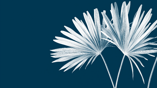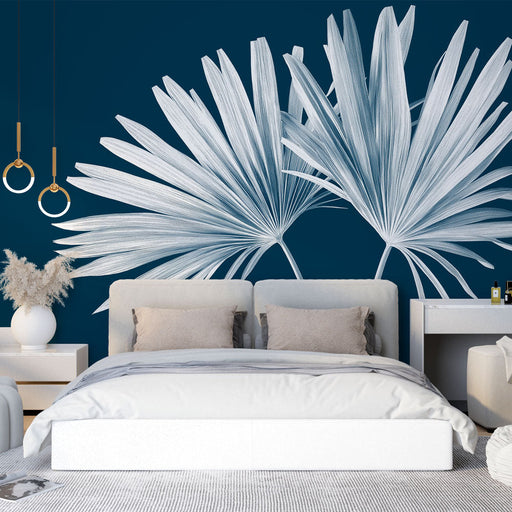 Προβολή πλήρων λεπτομερειώνΜουραλ γουολπεηπερ τιλ μπλε | Λευκά τροπικά φύλλα σε σκούρο μπλε φόντο