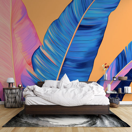 WonderMuralΑυτή η ταπετσαρία τοίχου διαθέτει ένα μεγαλοπρεπές μοτίβο από τροπικά φύλλα, συνδυάζοντας αποχρώσεις του μπλε και του ροζ σε ένα ζωντανό πορτοκαλί ...