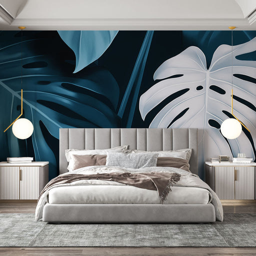 Προβολή πλήρων λεπτομερειώνΤαπετσαρία τοίχου μπλε φύλλα μονστέρα | Ένας τροπικός και εκλεπτυσμένος σχεδιασμός