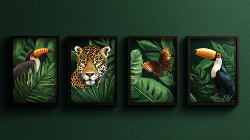 Προβολή πλήρων λεπτομερειώνΤαπετσαρία ζούγκλας ζώα | Ένας λεοπάρδαλης, ένας νεκροφόρος και πολύχρωμα πουλιά