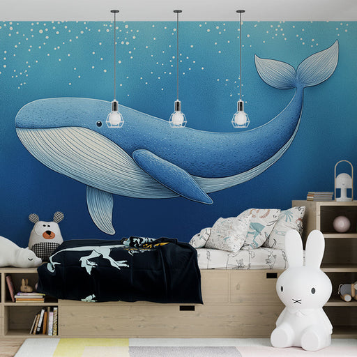 Προβολή πλήρων λεπτομερειώνΤαπετσαρία τοιχογραφίας φάλαινα | Εικονογράφηση μιας μπλε φάλαινας που κολυμπά σε ένα καταπραϋντικό ωκεανό