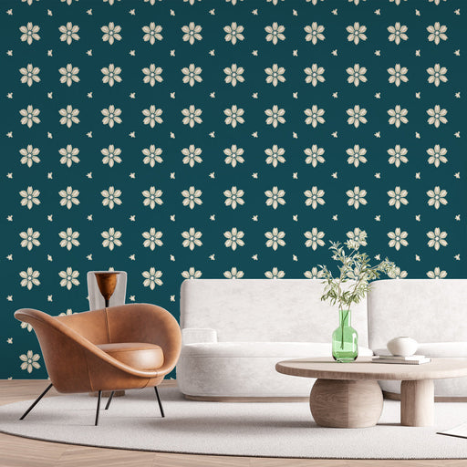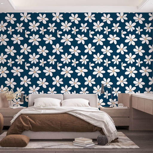 WonderMuralΑυτό το ταπετσαρία διαθέτει ένα γοητευτικό μοτίβο από λευκά λουλούδια λεπτά τοποθετημένα σε ένα βαθύ μπλε φόντο, δημιουργώντας μια ατμόσφαιρα που ε...