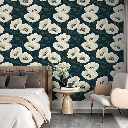 WonderMuralΤο ταπετσαρία μας διαθέτει ένα όμορφο μοτίβο από λευκά ανεμώνη απαλά διατεταγμένα σε ένα βαθύ μεσάνυχτα μπλε φόντο. Τα λουλούδια, μεγάλης κομψότητα...