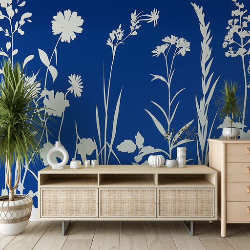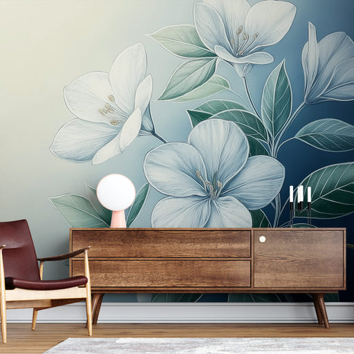 Προβολή πλήρων λεπτομερειώνΤαπετσαρία τοίχου λευκά λουλούδια | Απαλές σιλουέτες σε μπλε φόντο