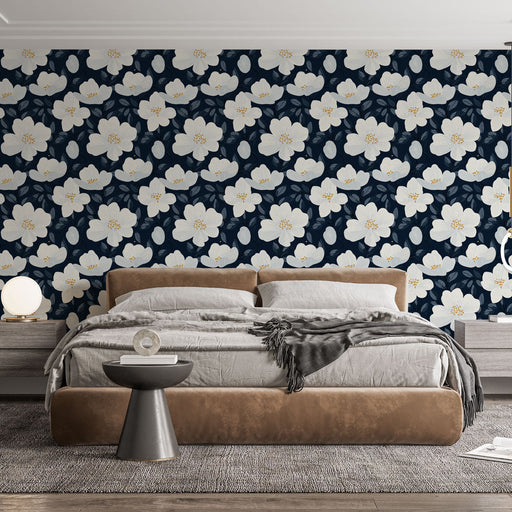 WonderMuralΑυτό το όμορφο ταπετσαρία τοίχου διαθέτει ένα μοτίβο λευκών λουλουδιών σε πλήρη ανθοφορία, ενισχυμένο από πράσινα φύλλα, σε ένα κομψό μεσάνυχτα μπλ...