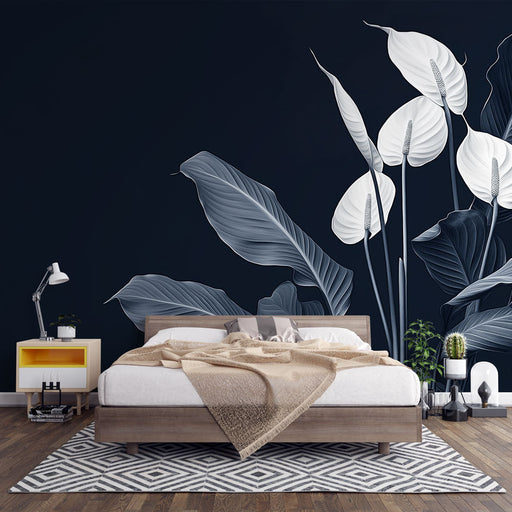 WonderMuralΑυτή η υπέροχη ταπετσαρία τοίχου αναδεικνύει μεγάλα λευκά φύλλα με διακριτικές γαλαζωπές αποχρώσεις, κομψά τοποθετημένα σε ένα βαθύ μπλε-πράσινο φό...