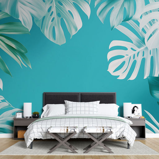 Προβολή πλήρων λεπτομερειώνΤαπετσαρία τοιχογραφίας μπλε τιρκουάζ | Εξωτικό φύλλωμα σε τυρκουάζ φόντο