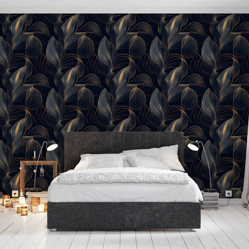 WonderMuralΤο όμορφο Tapete μας διαθέτει ένα μοτίβο στιλιζαρισμένων φύλλων σε χρυσές αποχρώσεις, αντιθέτοντας με ένα σκούρο φόντο που δημιουργεί ένα εντυπωσια...