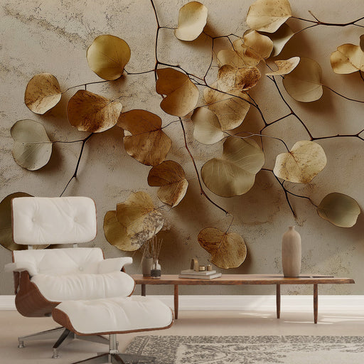 Προβολή πλήρων λεπτομερειώνΤαπετσαρία τοιχογραφίας αποξηραμένα φύλλα | Διακλάδωση χρυσών και λευκών φύλλων σε υφή φόντου