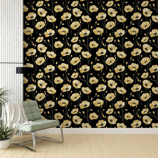 WonderMuralΑυτό το ταπετσαρία διακρίνεται από το εντυπωσιακό μοτίβο των χρυσών λουλουδιών που κοσμούν ένα έντονο μαύρο φόντο. Η πλούσια λεπτομέρεια και η απόχ...