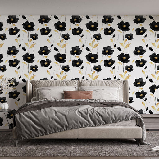Προβολή πλήρων λεπτομερειώνΤαπετσαρία τοιχωμάτων λουλουδιών μαύρη και χρυσή | Κομψά μοτίβα μαύρων λουλουδιών σε λευκό φόντο