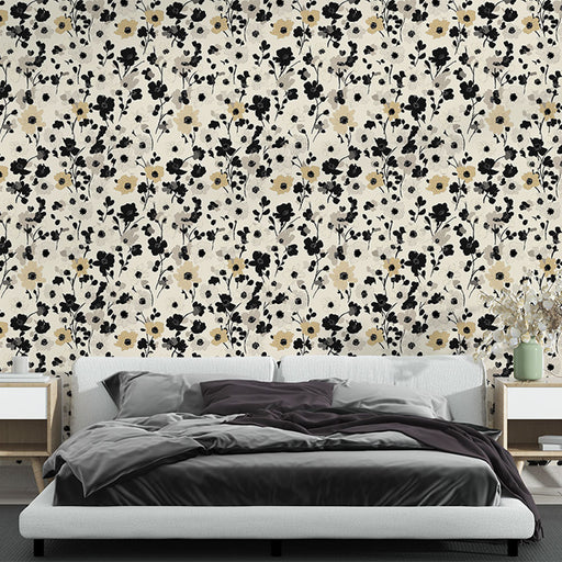 WonderMuralΤο αποκλειστικό μας Ταπετσαρία Τοίχου δείχνει ένα δυναμικό λουλουδένιο μοτίβο, όπου λευκά και κίτρινα λουλούδια ανθίζουν ενάντια σε ένα φωτεινό μαύ...