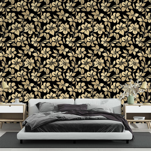 WonderMuralΑυτό το όμορφο ταπετσαρία τοιχωμάτων διαθέτει ένα διακριτικό σχέδιο χρυσών λουλουδιών λεπτά σχεδιασμένα, ξεχωρίζοντας απέναντι σε ένα βαθύ μαύρο φό...
