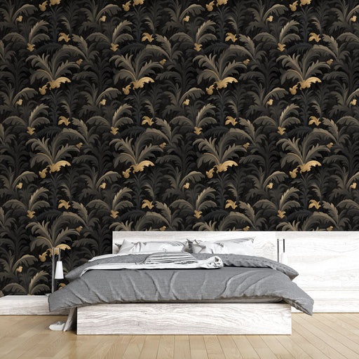 WonderMuralΑυτή η ταπετσαρία τοίχου διαθέτει έναν πλούσιο σχεδιασμό από χρυσά φύλλα φοίνικα που ξεχωρίζουν κομψά σε ένα σκοτεινό φόντο, δημιουργώντας μια συνα...