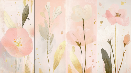 Προβολή πλήρων λεπτομερειώνTapete floral με απομίμηση ταμπλό | Υπέροχα ροζ λουλούδια και χρυσές πινελιές