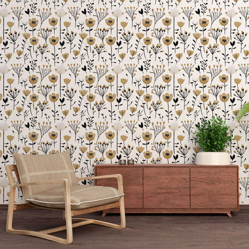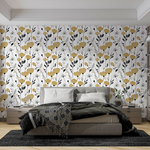 WonderMuralΑυτό το ταπετσαρία διαθέτει ένα κομψό μοτίβο από μαύρα και χρυσά λουλούδια που έχουν σχεδιαστεί με λεπτομέρεια πάνω σε ένα φωτεινό φόντο για ένα δι...
