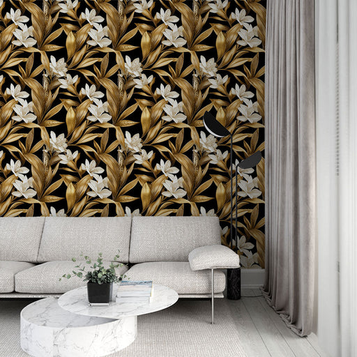 WonderMuralΑυτό το ταπετσαρία τοίχου αποκαλύπτει ένα όμορφο λουλουδένιο σχέδιο όπου λεπτά λευκά λουλούδια και χρυσά φύλλα αναμιγνύονται σε ένα βαθύ μαύρο φόντ...