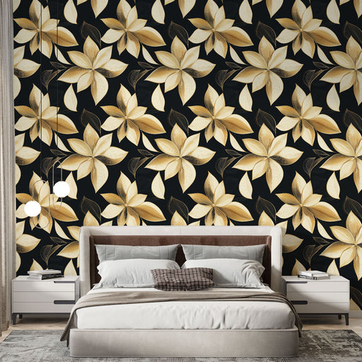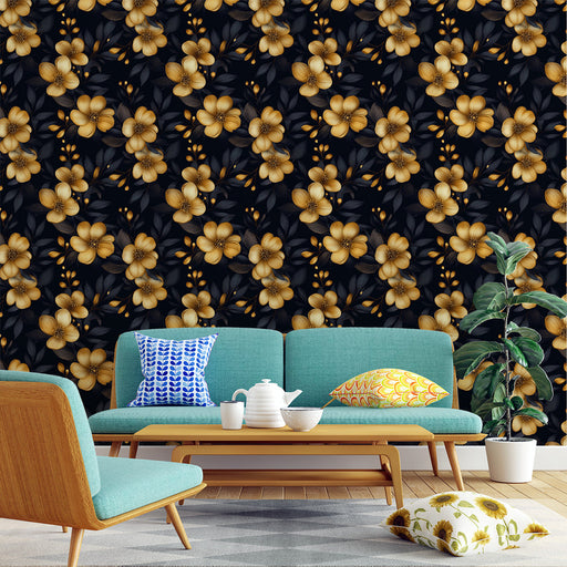 WonderMuralΑυτό το εντυπωσιακό ταπετσαρία με χρυσά λουλούδια σχεδιάζεται με λεπτομέρεια πάνω σε βαθύ μαύρο φόντο, δημιουργώντας ένα εντυπωσιακό αντίθεση που κ...