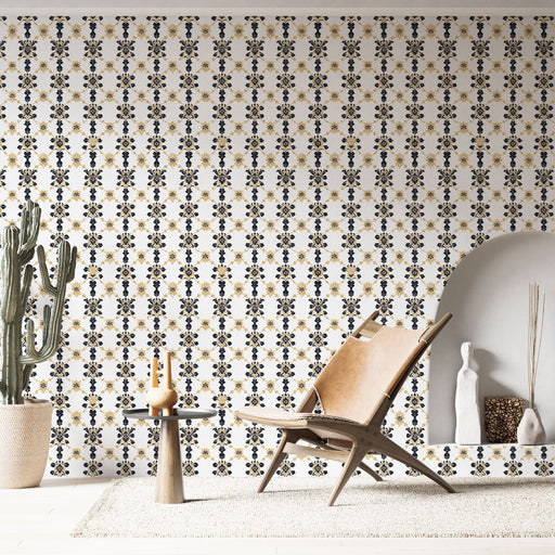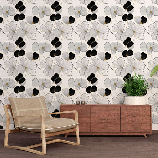 WonderMuralΑυτό το ταπετσαρία διαθέτει ένα κομψό λουλουδένιο μοτίβο, συνδυάζοντας με ευαισθησία λευκά λουλούδια με μαύρες περιγραφές και χρυσά κέντρα σε μαύρο...