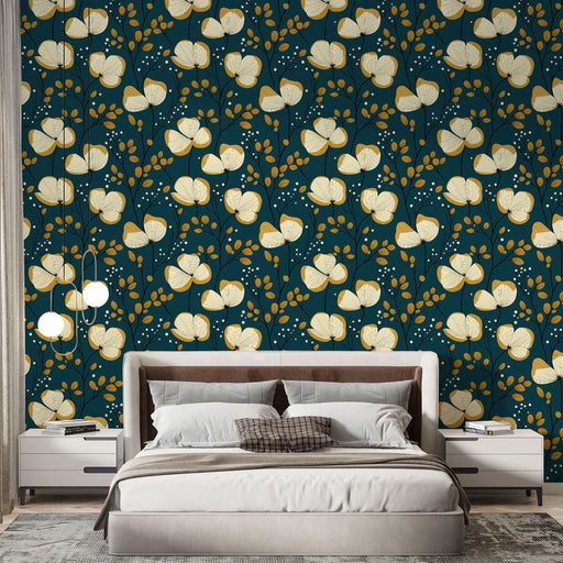 WonderMuralΑυτό το ταπετσαρία διαθέτει ένα κομψό σχέδιο με χρυσά λουλούδια που ξεχωρίζουν από ένα βαθύ μεσάνυχτα μπλε φόντο. Λεπτά κλαδιά πλεκόνται με χάρη, σ...