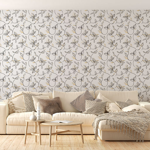 WonderMuralΤο ταπετσαρία μας διαθέτει ένα λεπτό σχέδιο με μαύρα φύλλα που πλέκονται με χρυσές πινελιές, όλα σε ένα φωτεινό λευκό φόντο. Αυτό το μινιμαλιστικό ...