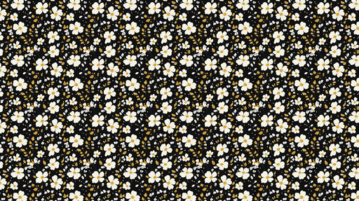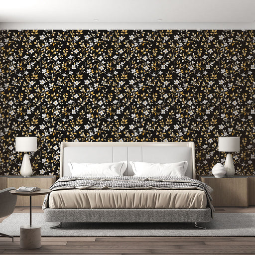 WonderMuralΑυτό το ταπετσαρία διαθέτει ένα όμορφο λουλουδένιο μοτίβο που συνδυάζει λεπτά λευκά λουλούδια και χρυσά φύλλα ενάντια σε ένα βαθύ μαύρο φόντο. Η συ...